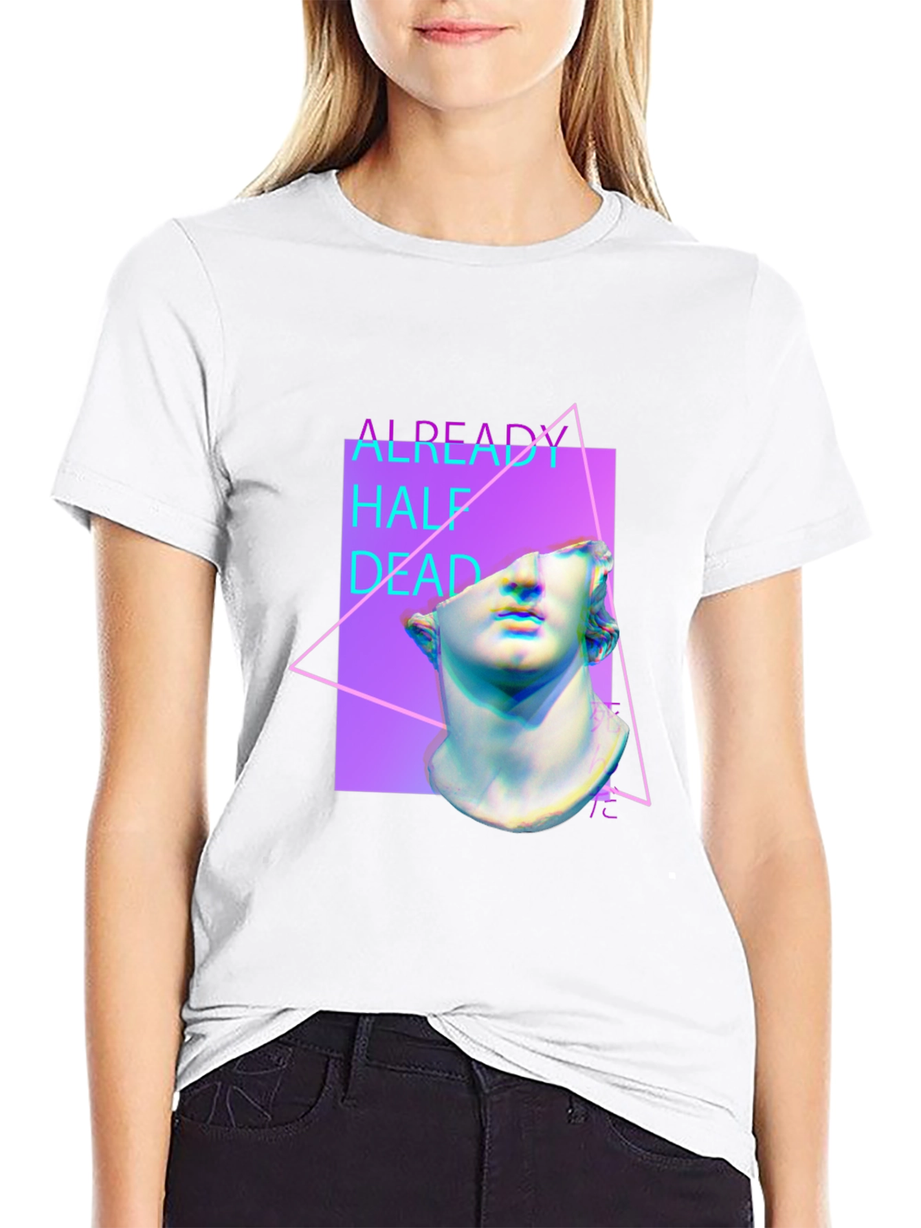 This unique black t-shirt features a striking graphic design with a fragmented statue head set against a vibrant purple backdrop and pink triangle. Bold cyan lettering reads "Already Half Dead." The design is perfect for those who appreciate edgy, artistic fashion. Made from a soft-looking, breathable fabric, this t-shirt offers both comfort and style. Ideal for casual wear, concerts, or making a statement. Express your individuality with this eye-catching tee. Upgrade your wardrobe with this unique statement piece!