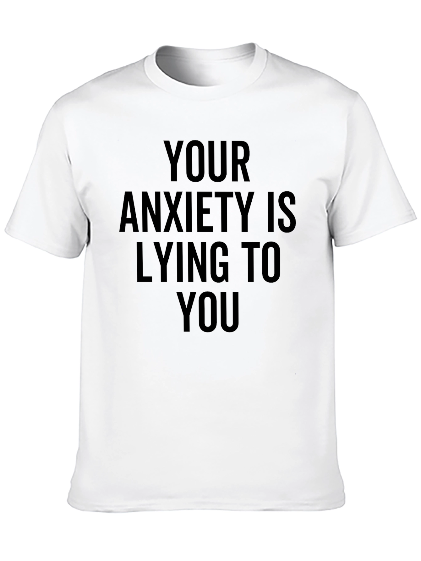 This bold black t-shirt features a powerful message: "Your Anxiety Is Lying To You." Crafted from comfortable cotton, this tee is perfect for raising awareness and sparking conversations about mental health. The striking text stands out against the dark fabric, making a statement wherever you go. Wear it to support loved ones, promote self-care, or simply express your own journey. This versatile t-shirt is ideal for casual outings, social gatherings, or relaxing at home. Its classic fit ensures all-day comfort, while its meaningful design encourages positivity and resilience. Spread a message of hope and challenge negative thinking with this impactful graphic tee.