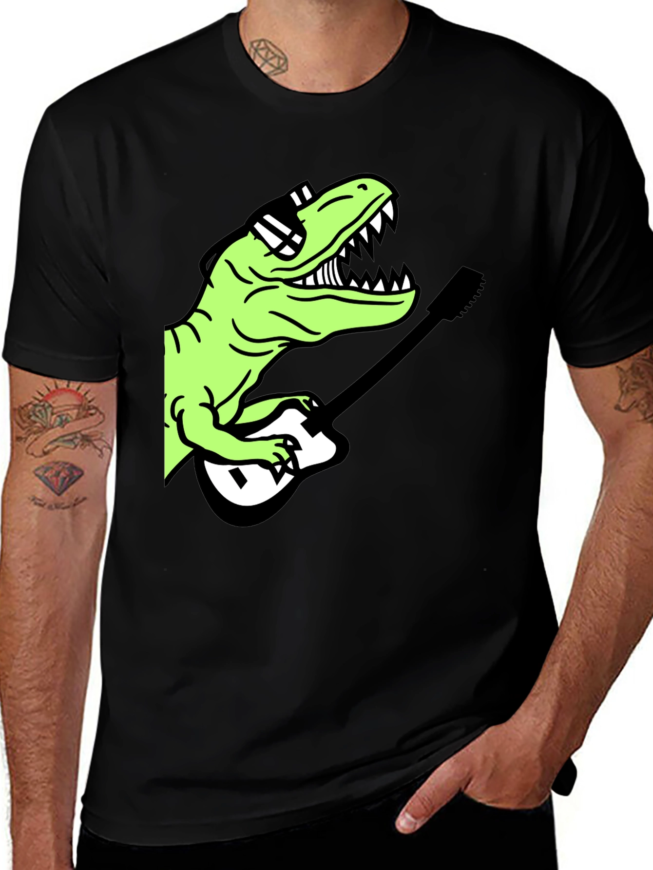 Rock out with this eye-catching black t-shirt! Featuring a vibrant green cartoon dinosaur shredding on a guitar, this tee adds a fun and edgy twist to your wardrobe. The dinosaur, sporting cool sunglasses, gives off a playful yet rebellious vibe. Made from a comfortable fabric, it's perfect for casual wear, concerts, or expressing your unique style. Stand out from the crowd with this unique conversation-starter. The unisex design and classic fit make it an awesome gift for music lovers and dino enthusiasts alike. Get yours now and let the good times roll!
