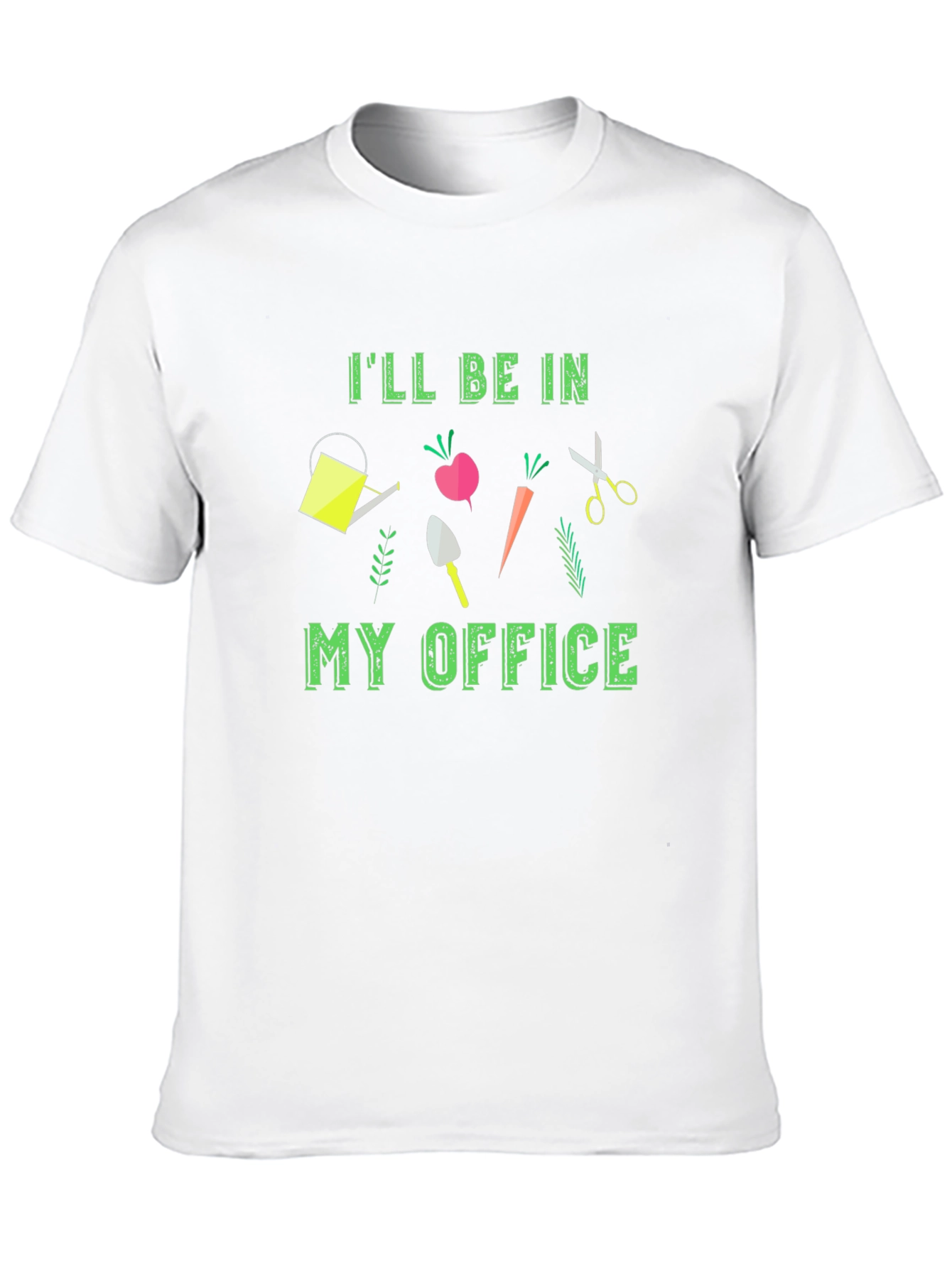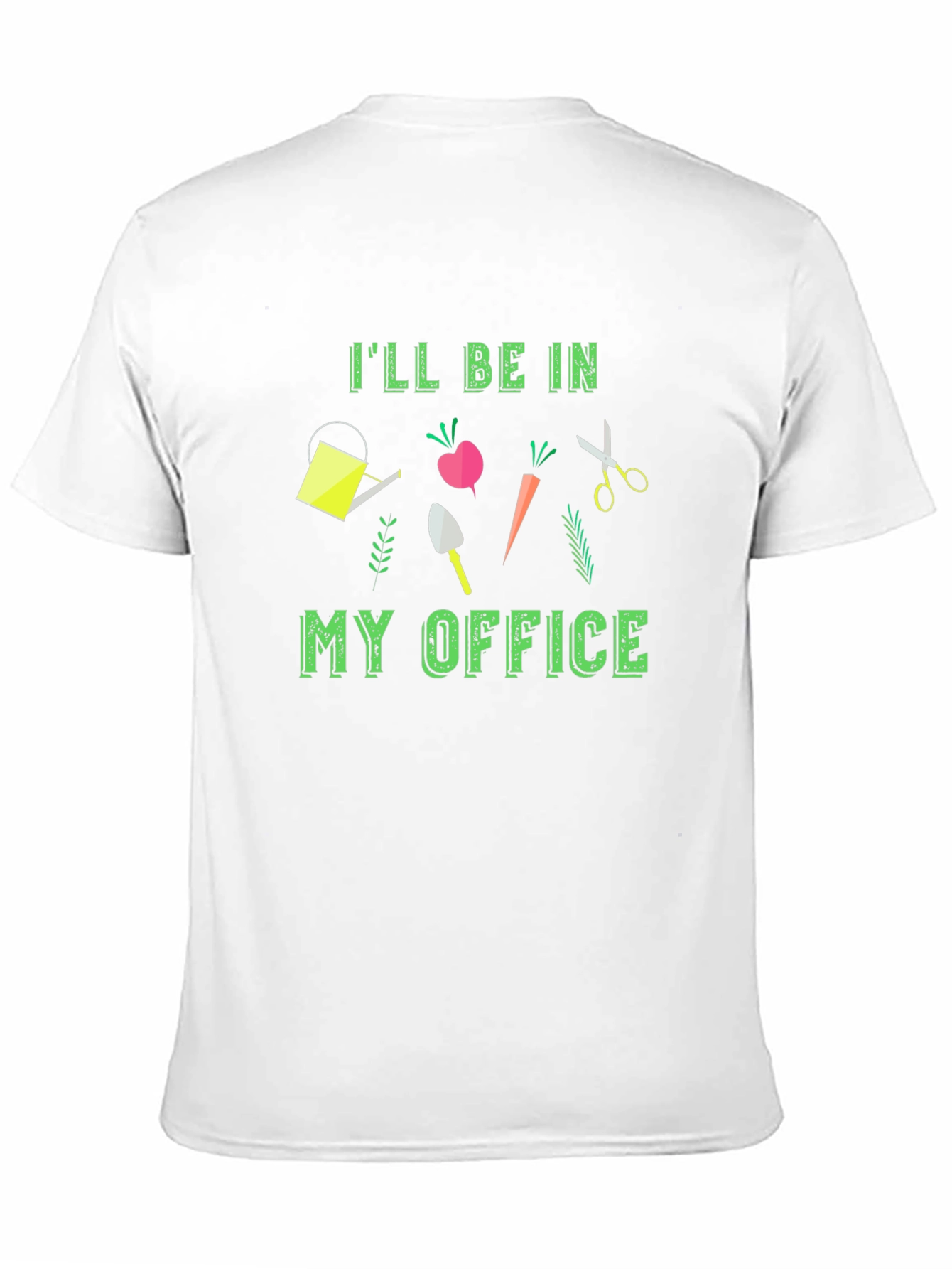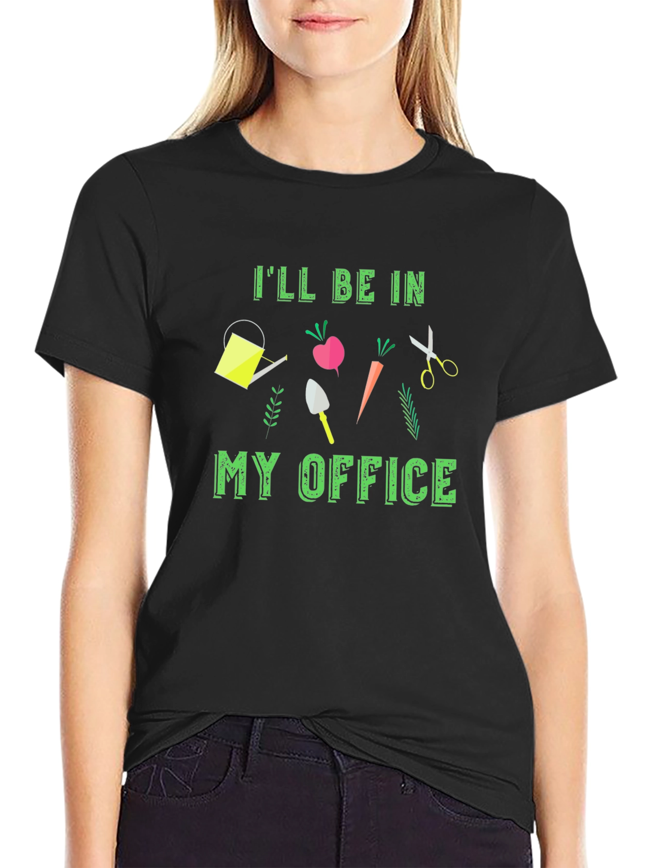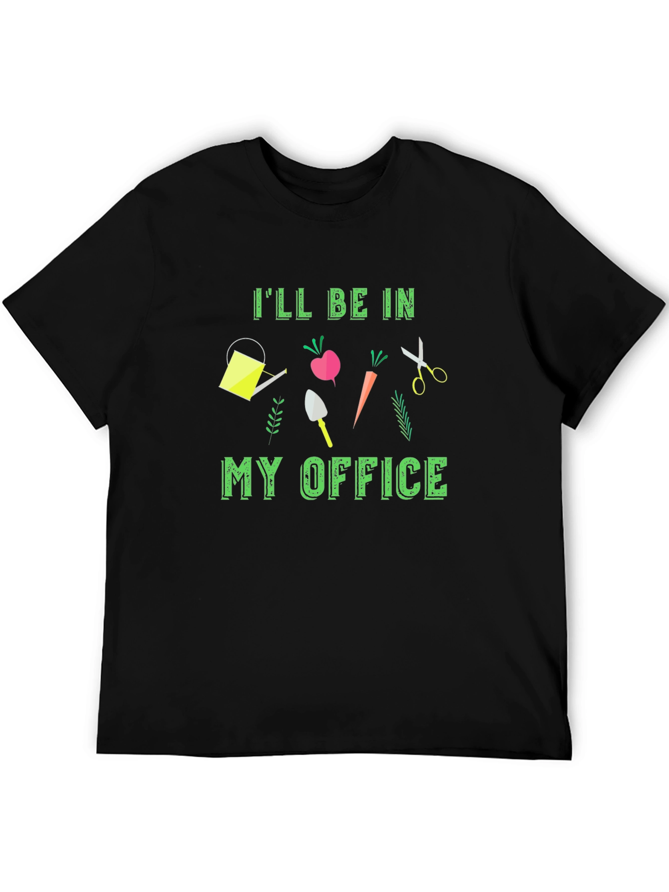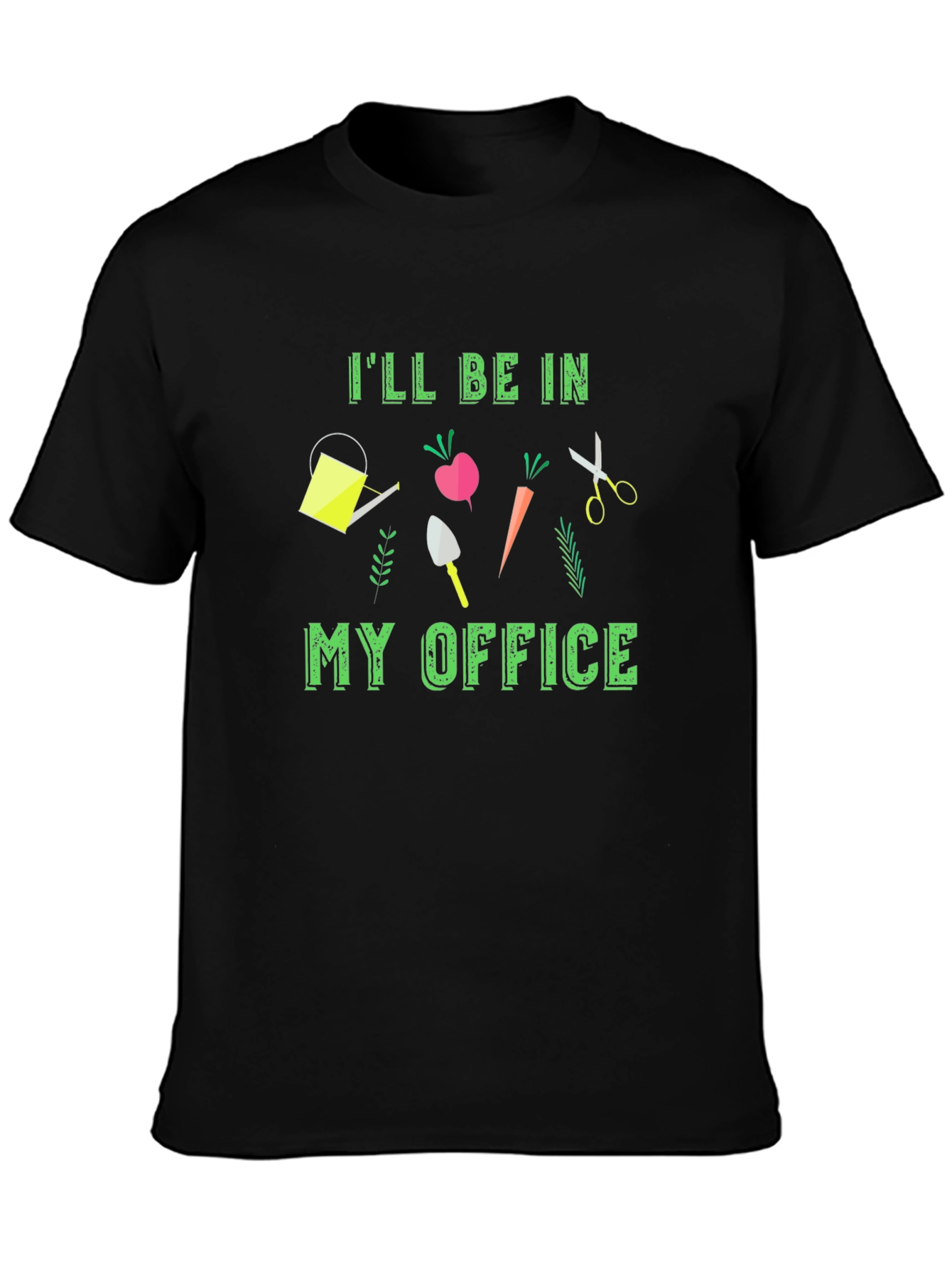 Declare your love for gardening with this unique black t-shirt! This tee features a fun, playful design with green text that reads, "I'll be in my office." The design includes charming illustrations of gardening essentials: a watering can, beet, trowel, carrot, and scissors. Made from a comfortable material, this shirt is perfect for everyday wear, casual outings, or even a day spent tending your garden. Show off your green thumb with style! This t-shirt makes a great gift for any gardening enthusiast.