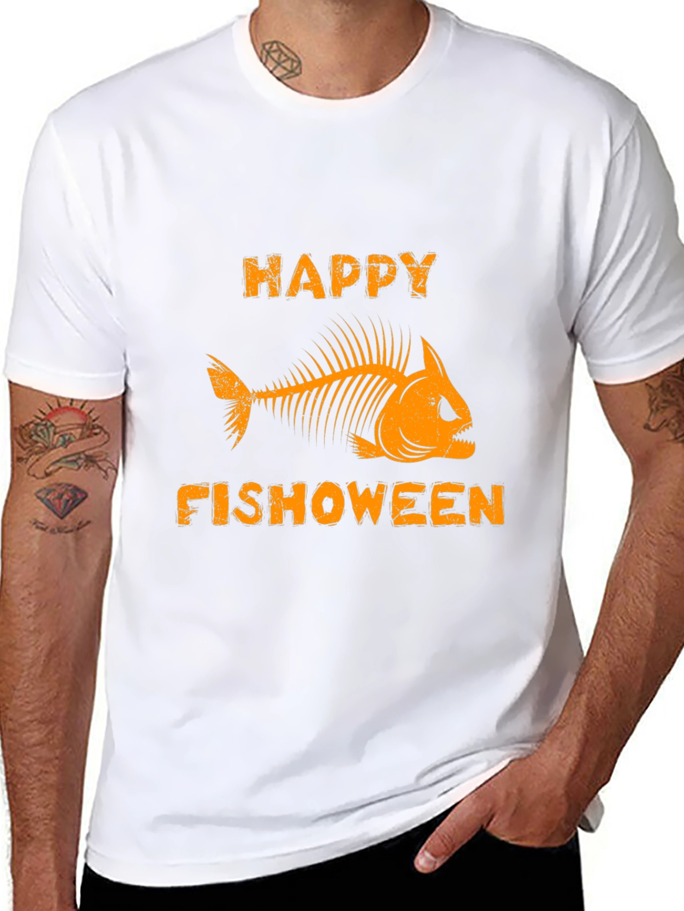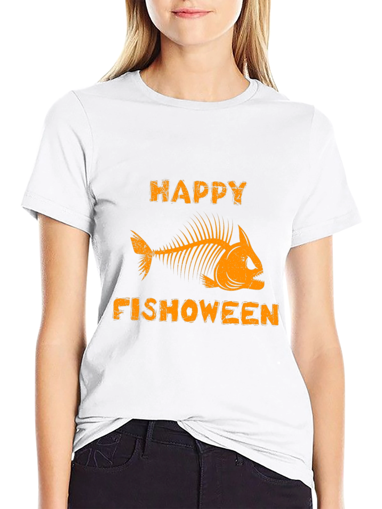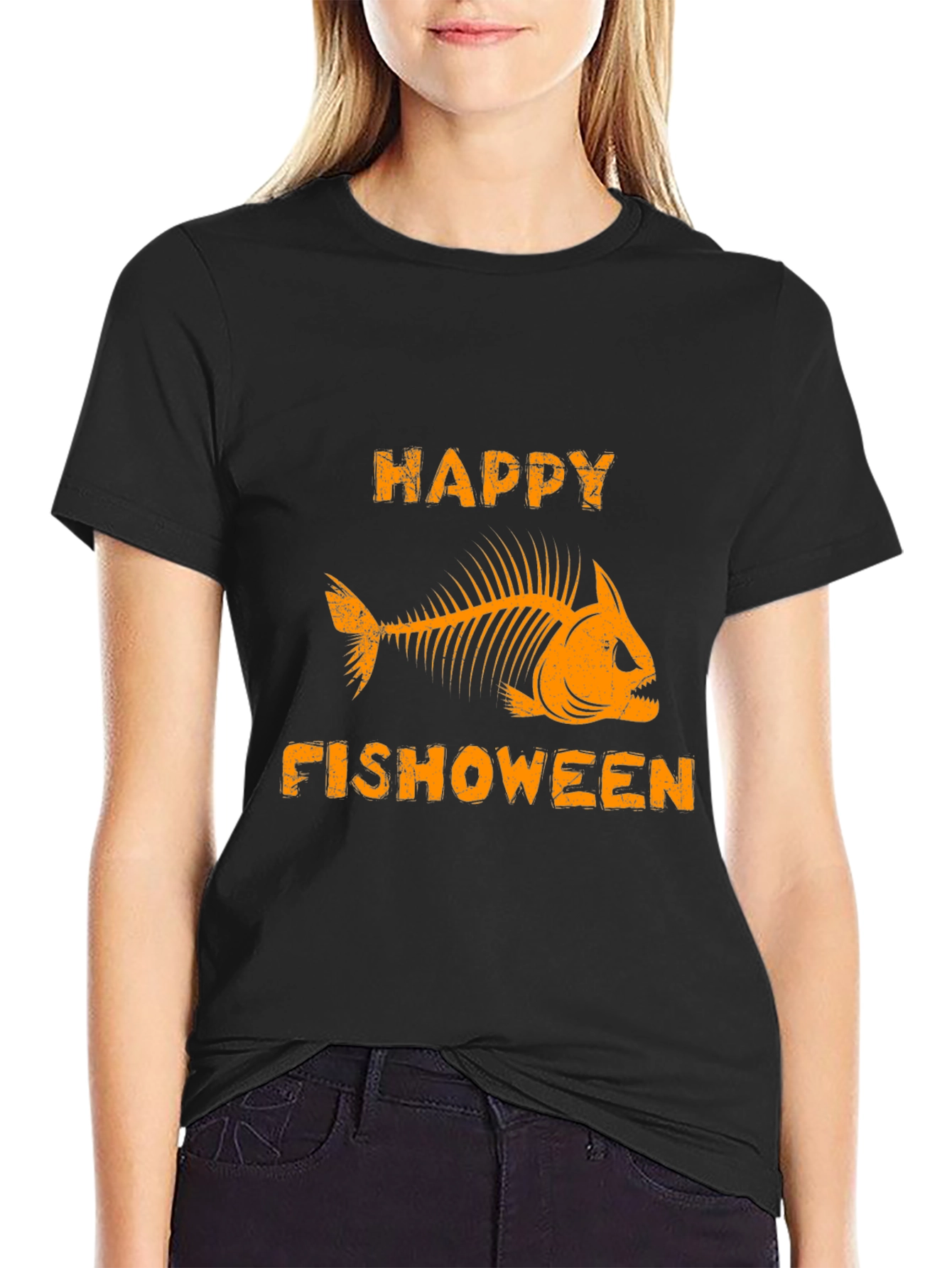 Celebrate Halloween with a twist with this unique "Happy Fishoween" t-shirt. Crafted from a soft, comfortable black fabric, this tee features a playful graphic design in orange. The centerpiece is a detailed fish skeleton, cleverly incorporating the Halloween theme with a marine element. The words "Happy" and "Fishoween" frame the image, adding to the festive spirit. Ideal for fishing enthusiasts or anyone looking for a fun and original Halloween outfit. Perfect for casual wear, Halloween parties, or trick-or-treating with a splash of humor. This shirt is sure to catch eyes and spark conversations wherever you go. Get ready for a fin-tastic Halloween!