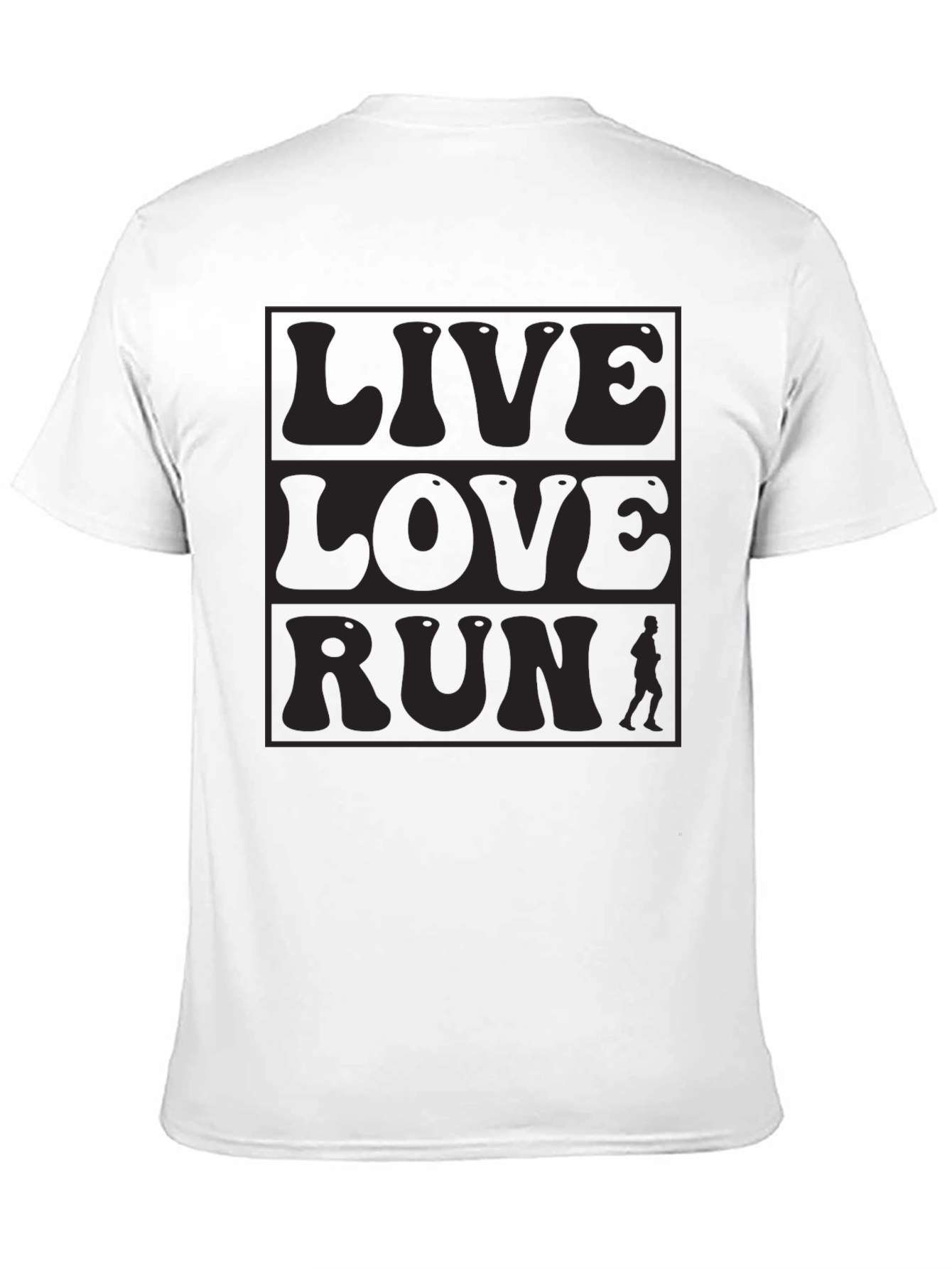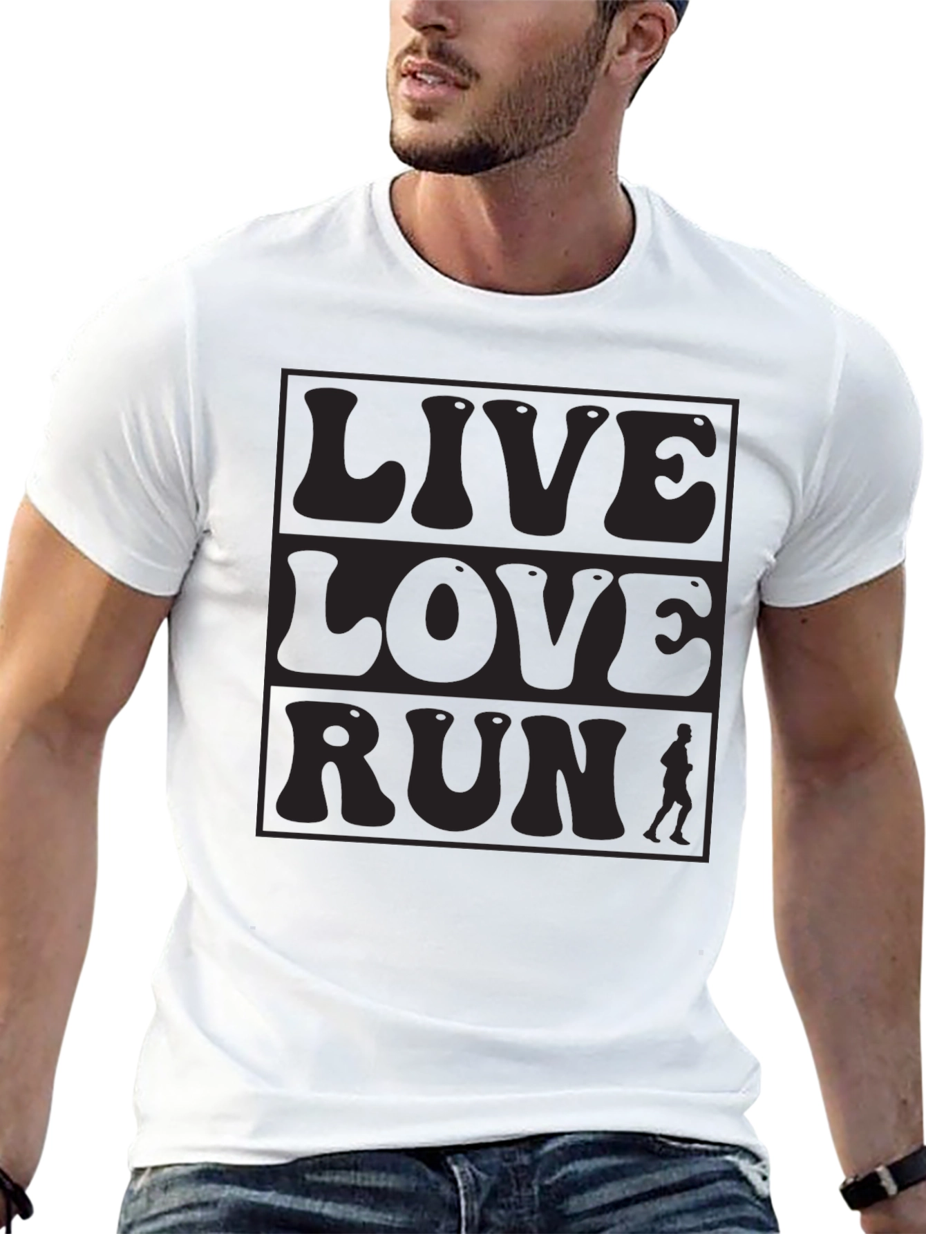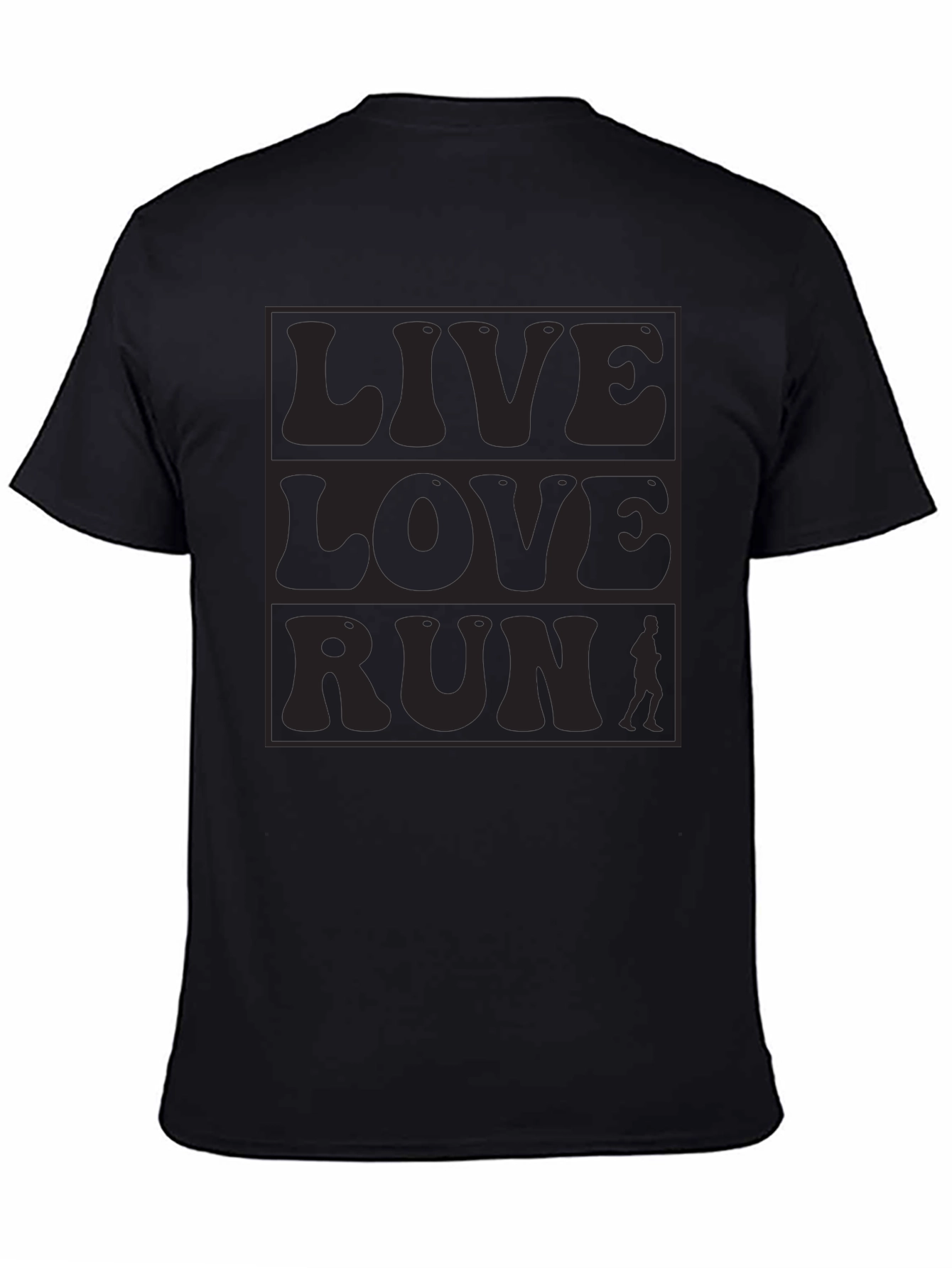 Show off your passion for running with this stylish black t-shirt. This tee features the motivational phrase "Live Love Run" stacked in a bold, eye-catching design. A silhouette of a runner completes the sporty look. Made from comfortable fabric, this shirt is perfect for everyday wear, workouts, or casual outings. Let this tee be a reminder to pursue your love for running and to live life to the fullest. Get yours today and inspire others with your dedication!