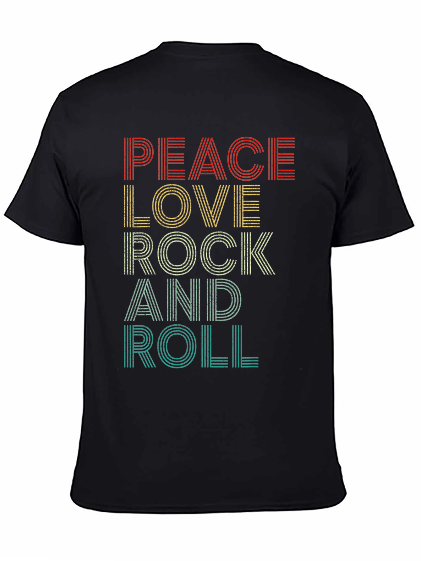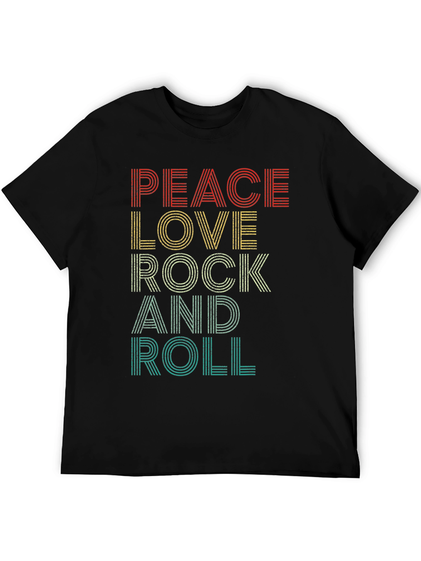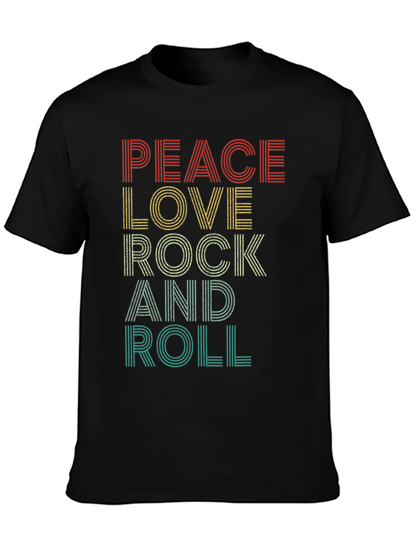 Embrace retro vibes with this stylish black t-shirt featuring the phrase "Peace Love Rock and Roll" in a stacked, multi-colored, striped design. The distressed print gives it a vintage feel, perfect for music lovers and those who appreciate a classic look. Made from comfortable, breathable fabric, this tee is ideal for casual wear, concerts, or just lounging around. Showcase your cool, laid-back style with this unique and eye-catching piece. This shirt makes a statement while keeping you comfortable all day long.
