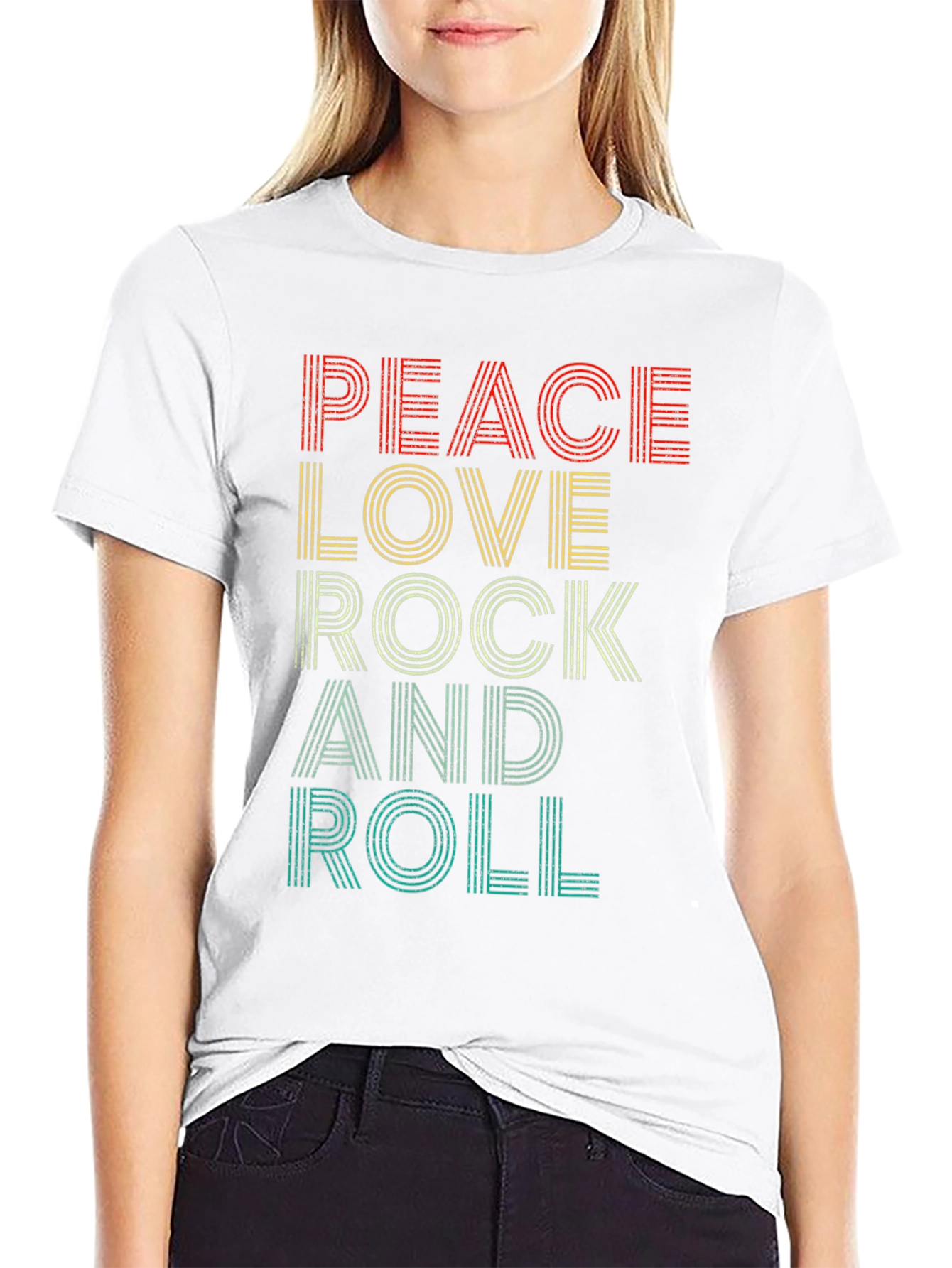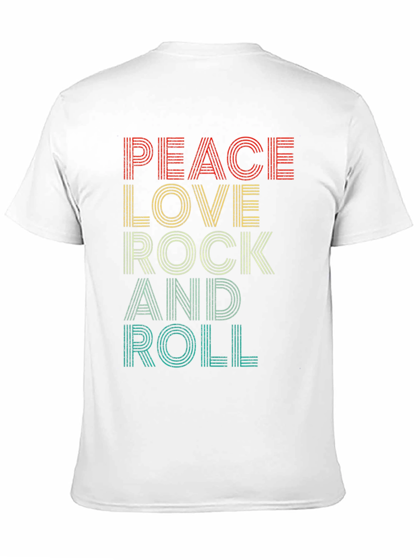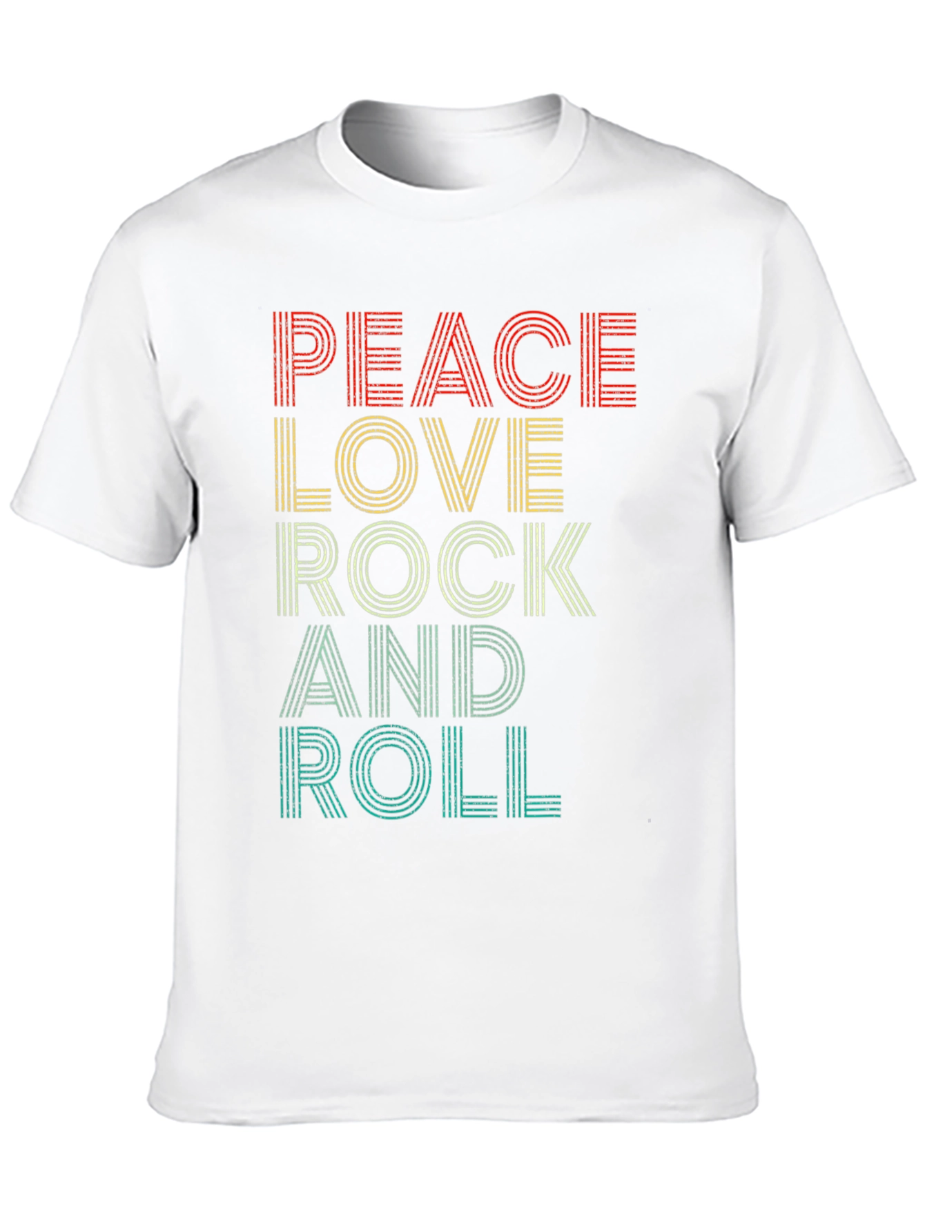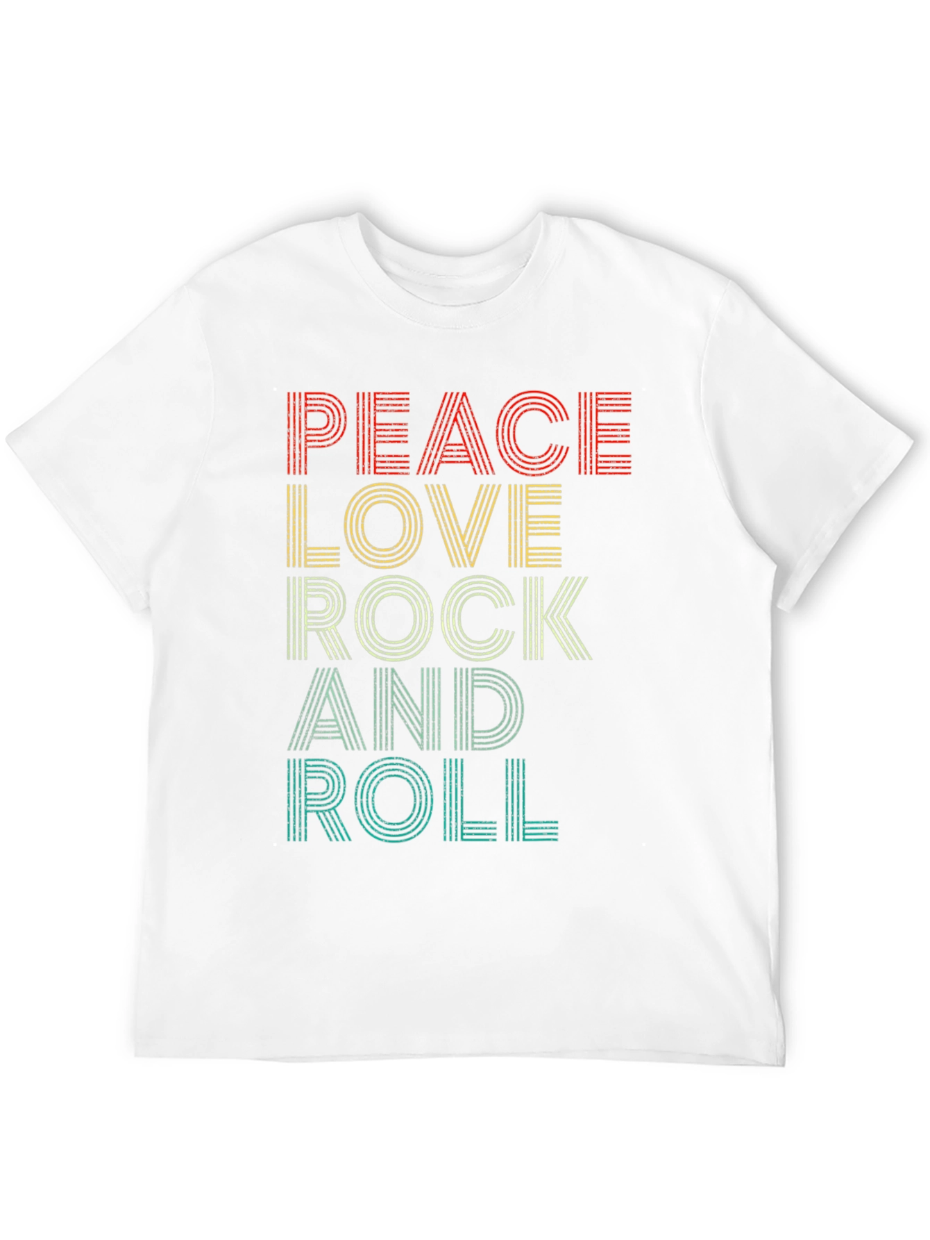 Embrace retro vibes with this stylish black t-shirt featuring the phrase "Peace Love Rock and Roll" in a stacked, multi-colored, striped design. The distressed print gives it a vintage feel, perfect for music lovers and those who appreciate a classic look. Made from comfortable, breathable fabric, this tee is ideal for casual wear, concerts, or just lounging around. Showcase your cool, laid-back style with this unique and eye-catching piece. This shirt makes a statement while keeping you comfortable all day long.