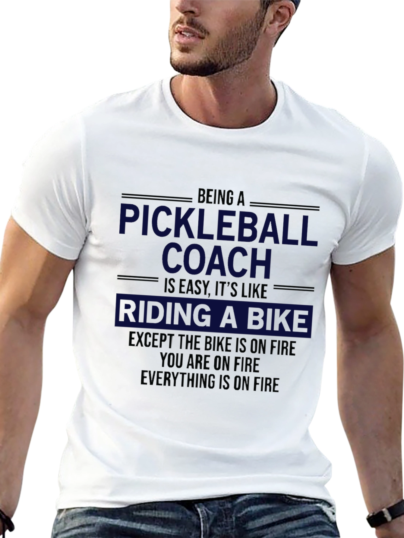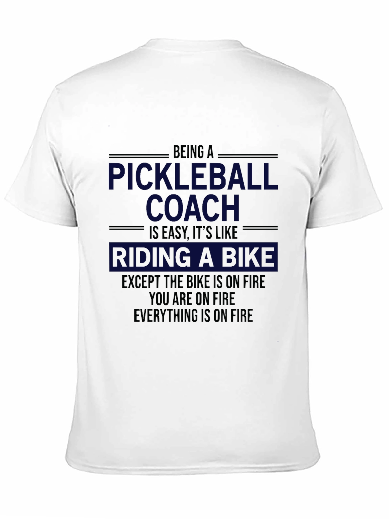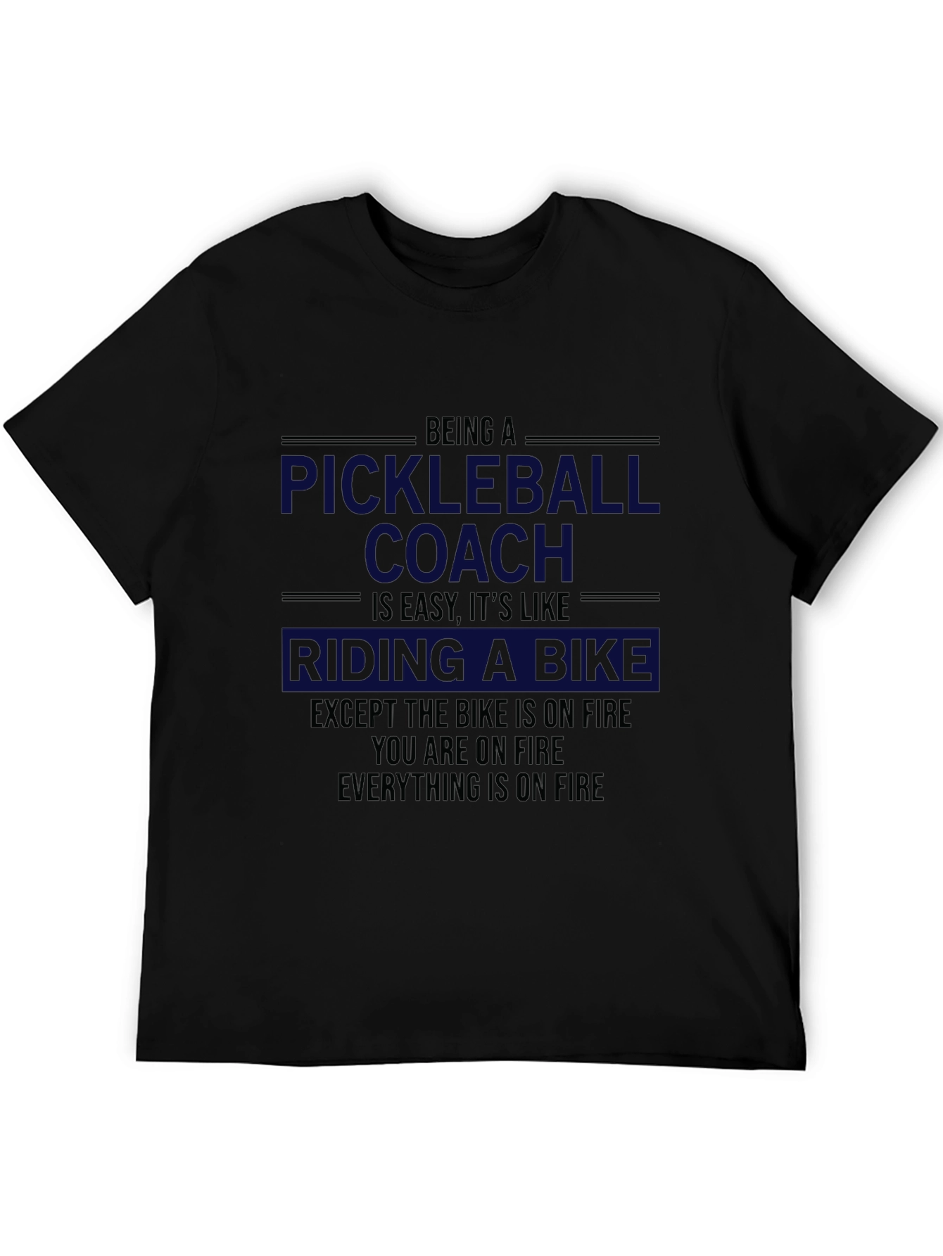 This t-shirt features a humorous graphic perfect for pickleball coaches with a sense of humor. The design reads "BEING A PICKLEBALL COACH IS EASY, IT'S LIKE RIDING A BIKE EXCEPT THE BIKE IS ON FIRE YOU ARE ON FIRE EVERYTHING IS ON FIRE." The shirt is black with blue text, making it a bold and eye-catching piece of apparel. Constructed from a soft and comfortable fabric, it's ideal for everyday wear, coaching sessions, or casual outings. This t-shirt makes a great gift for any pickleball coach who can appreciate a funny and relatable design.