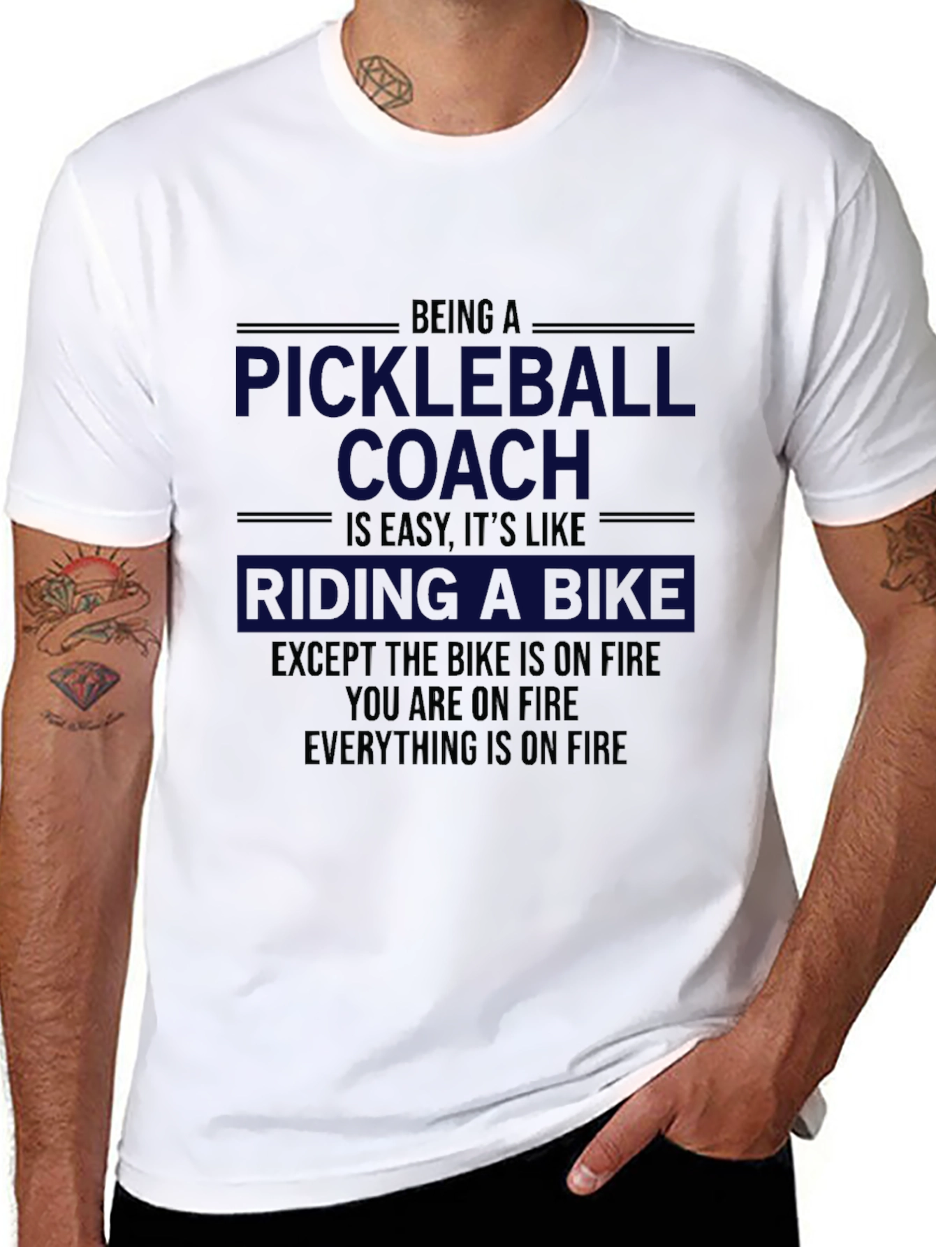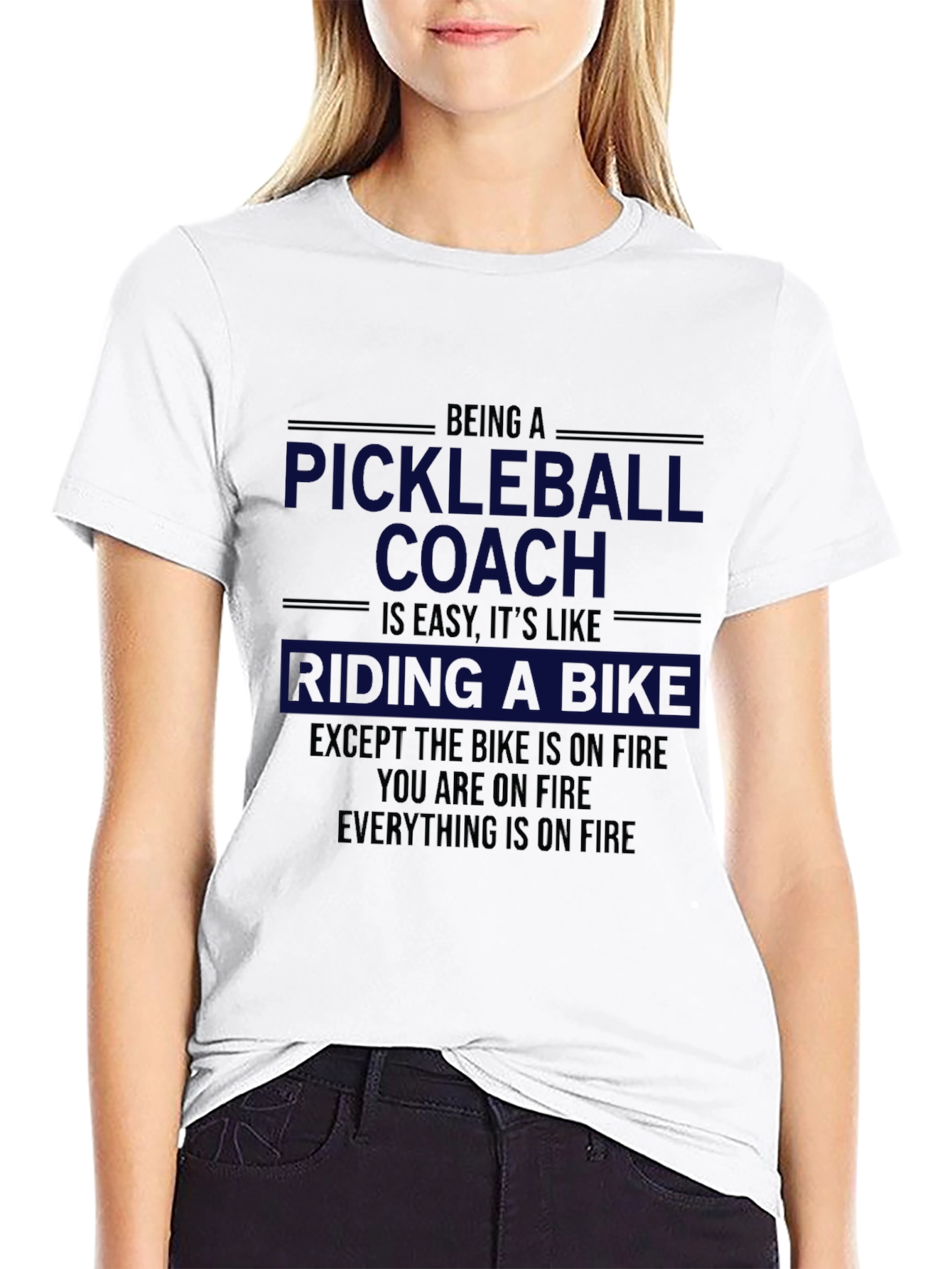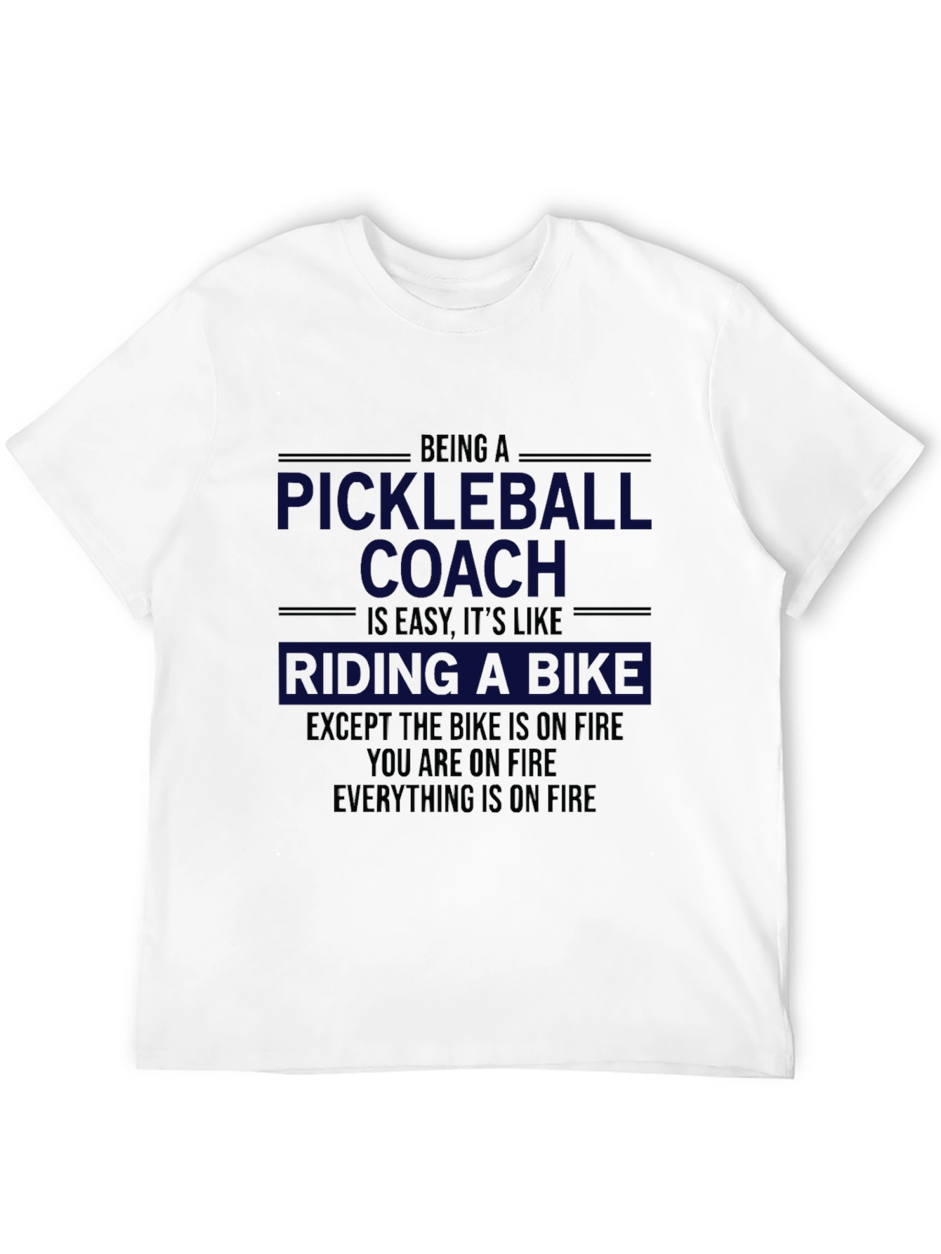 This t-shirt features a humorous graphic perfect for pickleball coaches with a sense of humor. The design reads "BEING A PICKLEBALL COACH IS EASY, IT'S LIKE RIDING A BIKE EXCEPT THE BIKE IS ON FIRE YOU ARE ON FIRE EVERYTHING IS ON FIRE." The shirt is black with blue text, making it a bold and eye-catching piece of apparel. Constructed from a soft and comfortable fabric, it's ideal for everyday wear, coaching sessions, or casual outings. This t-shirt makes a great gift for any pickleball coach who can appreciate a funny and relatable design.