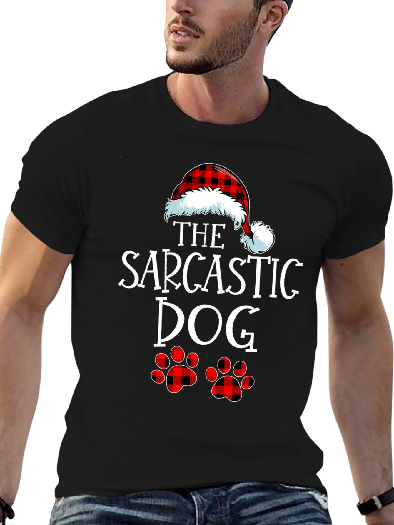 Show off your love for dogs and the holiday season with this unique graphic tee! Featuring a festive Santa hat, the words "The Sarcastic Dog," and adorable paw prints, all in a charming red and black plaid pattern, this black t-shirt is sure to turn heads. The design is eye-catching and perfect for casual wear during the Christmas season. Made from comfortable materials, this tee is ideal for holiday gatherings, dog walks, or simply lounging at home. Get yours today and spread some festive cheer!