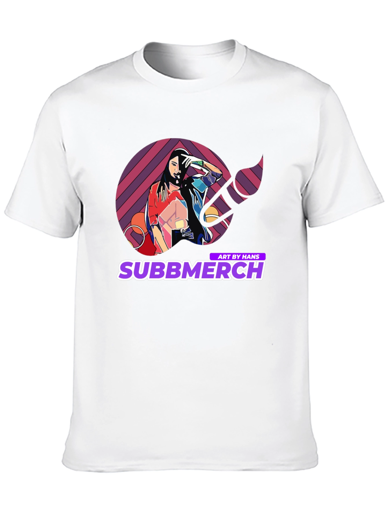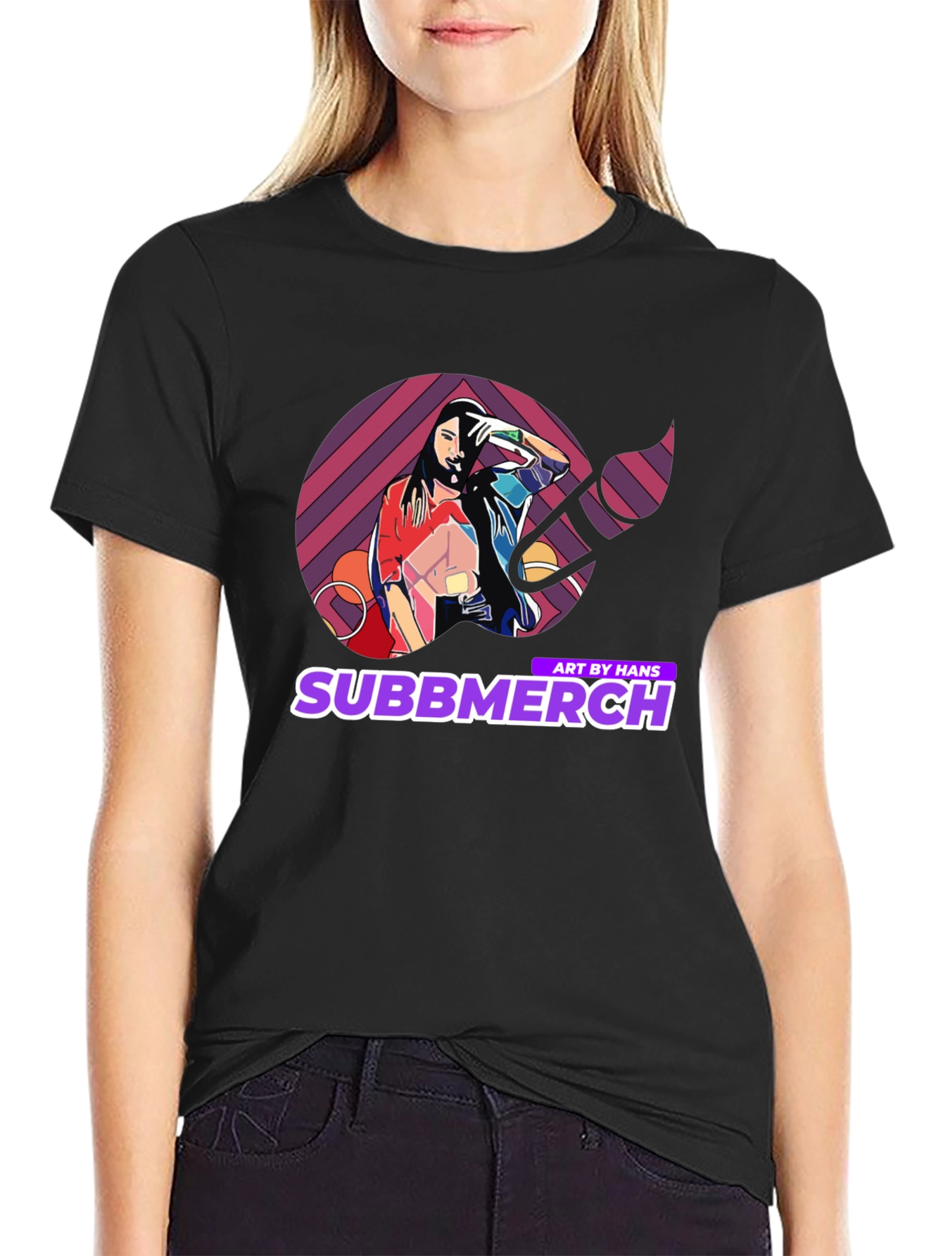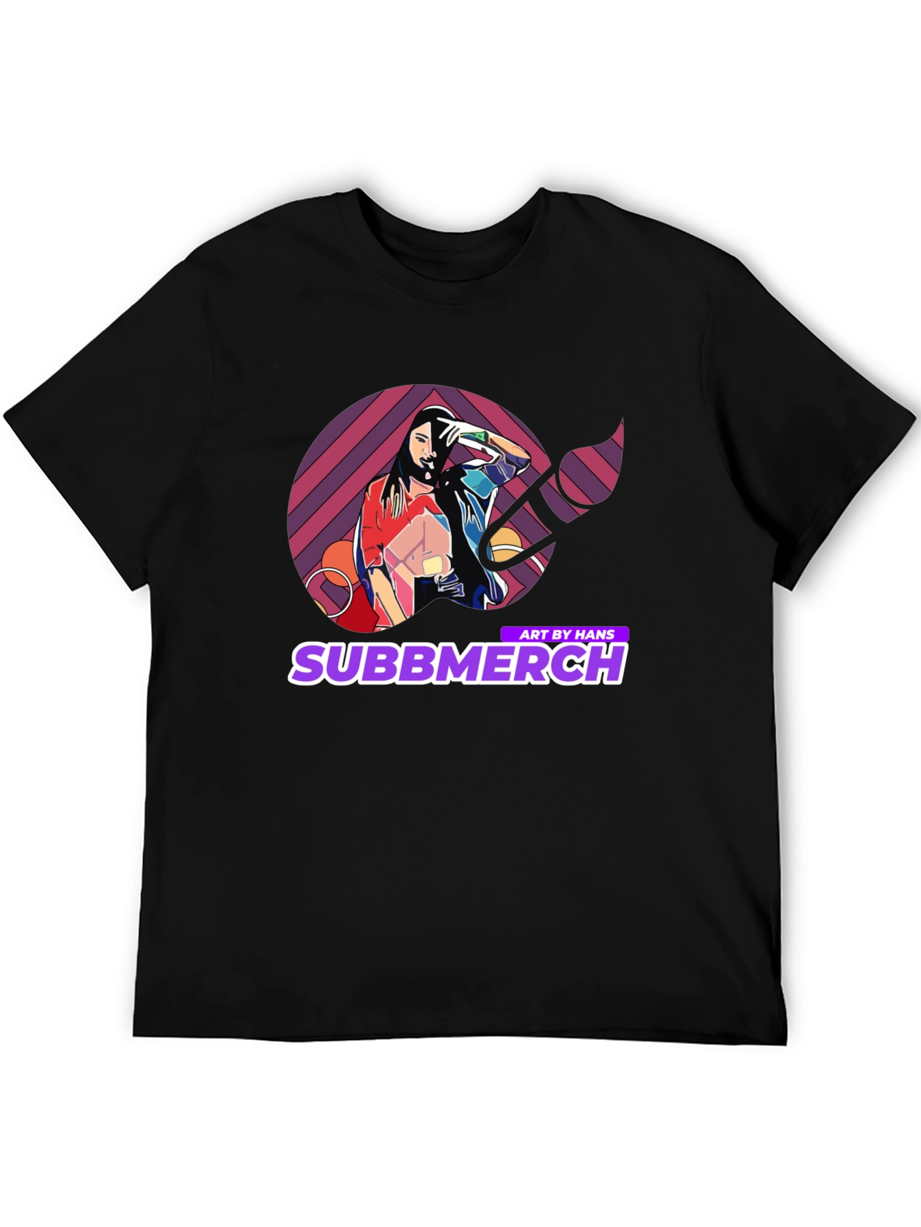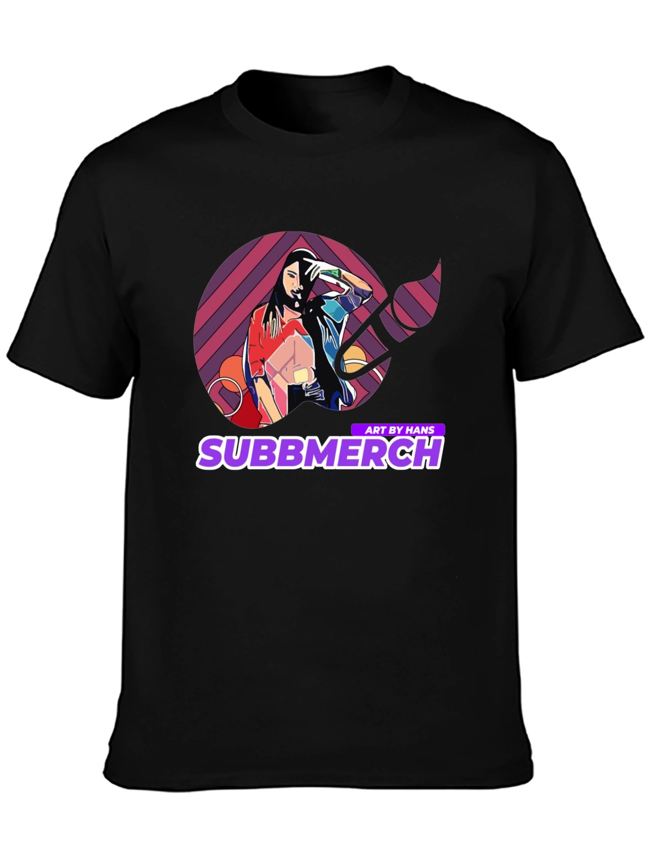 Elevate your casual wardrobe with this striking black t-shirt featuring a unique and vibrant graphic design. The artwork showcases a stylized image of a woman within a colorful geometric pattern, complemented by the 'Subbmerch' logo. Perfect for art enthusiasts and those who appreciate eye-catching apparel, this tee is made from a soft, comfortable fabric, ideal for everyday wear. Make a bold statement with this trendy piece, perfect for concerts, casual outings, or adding a creative touch to your style.
