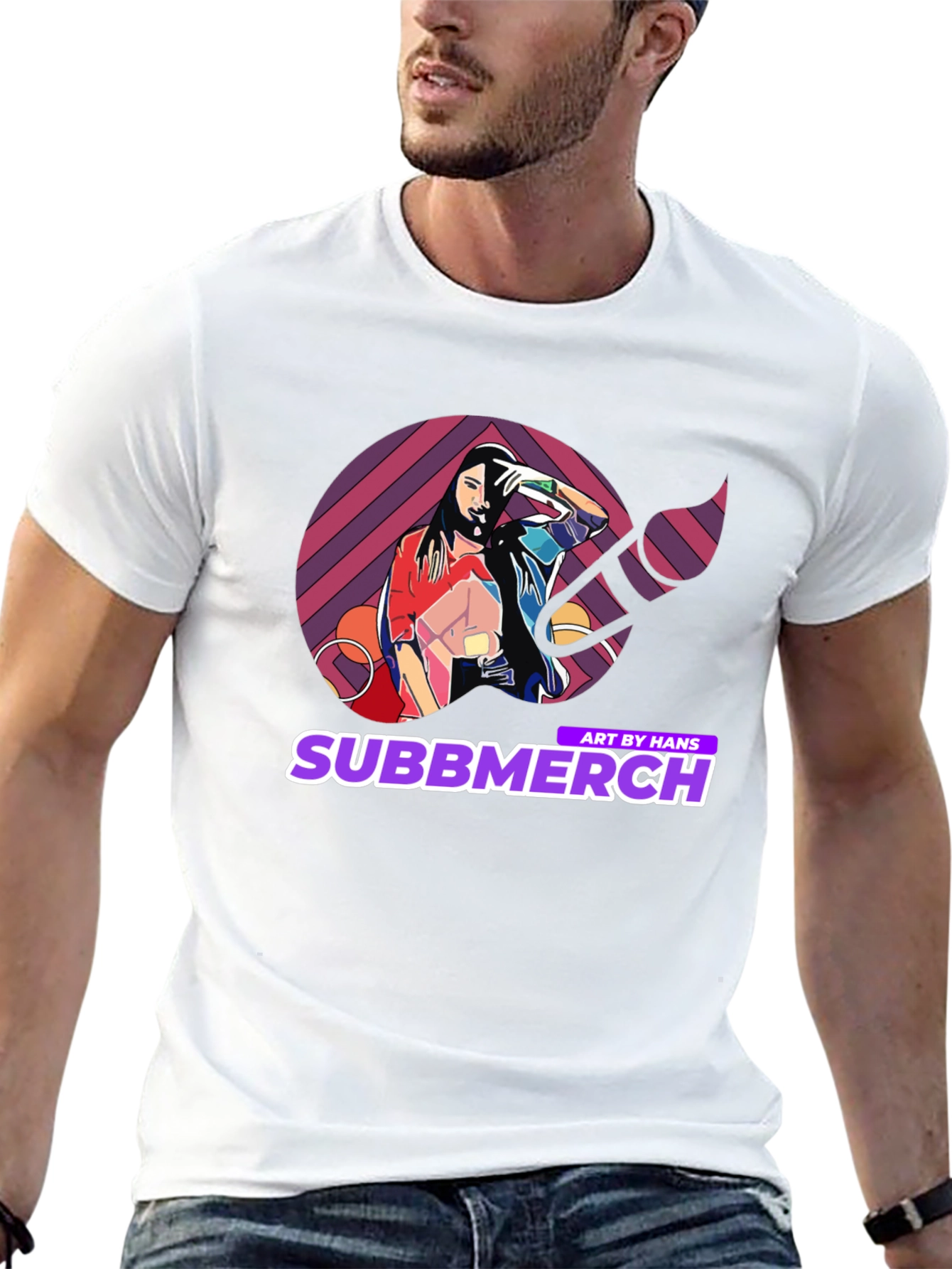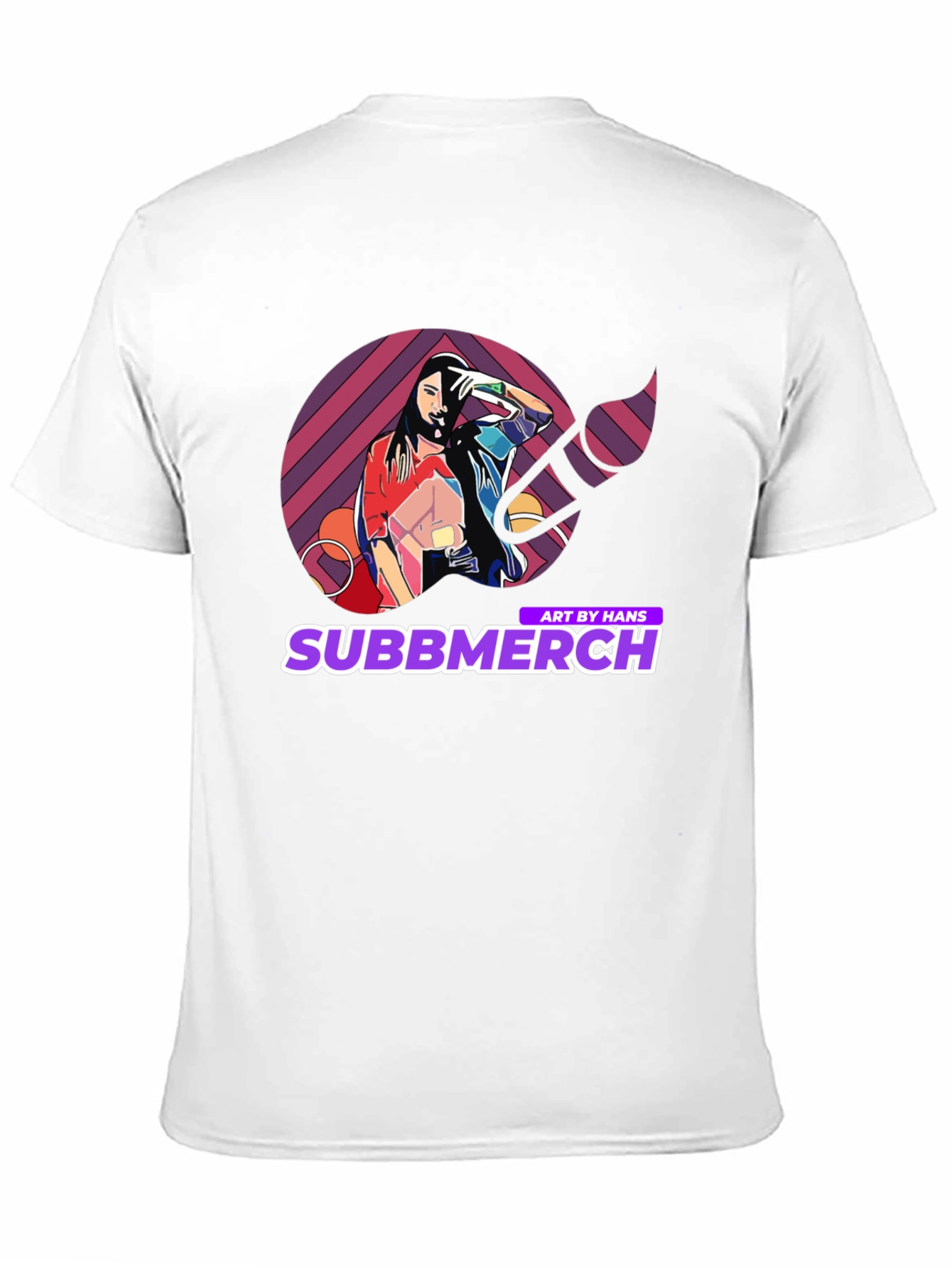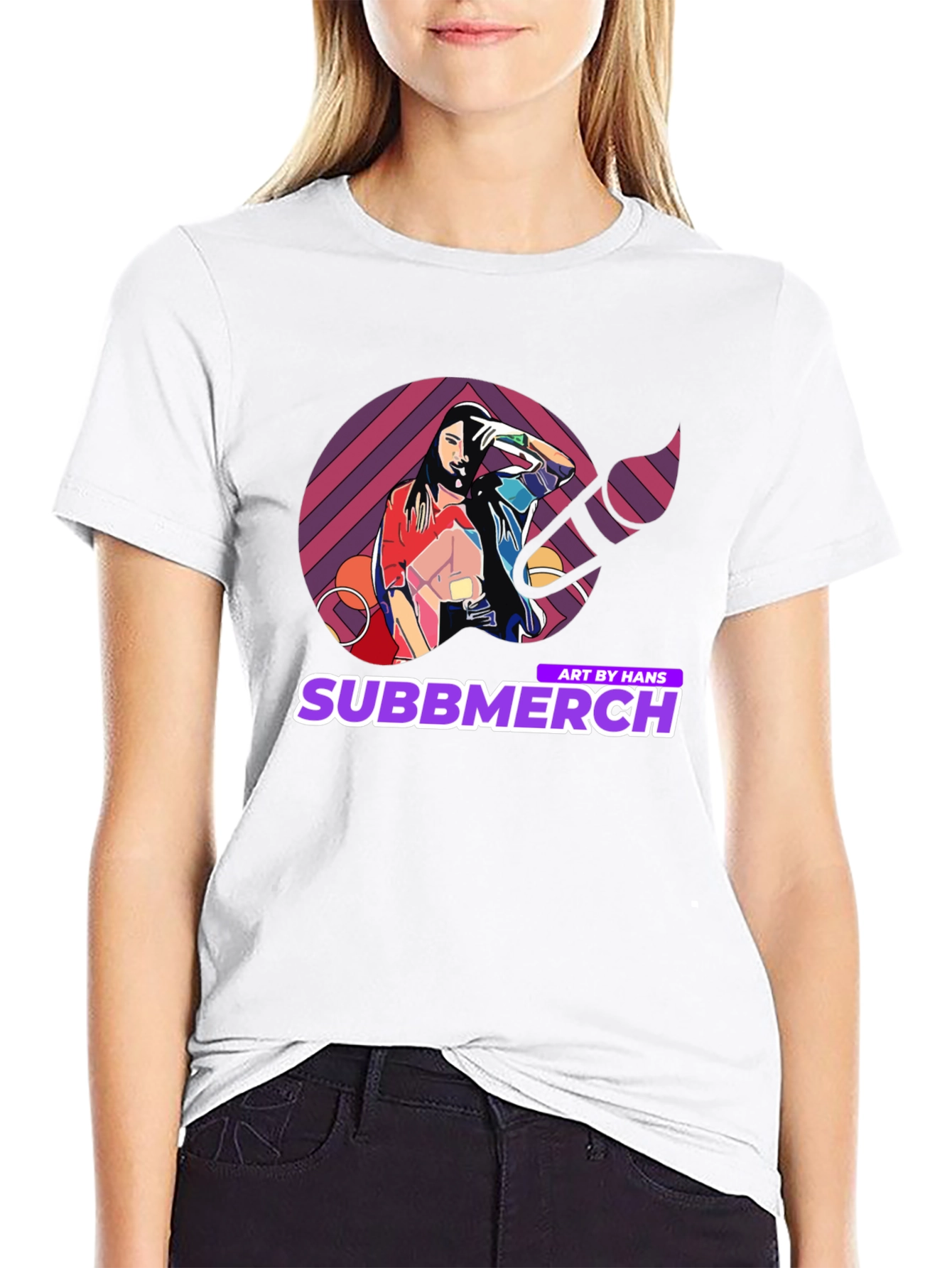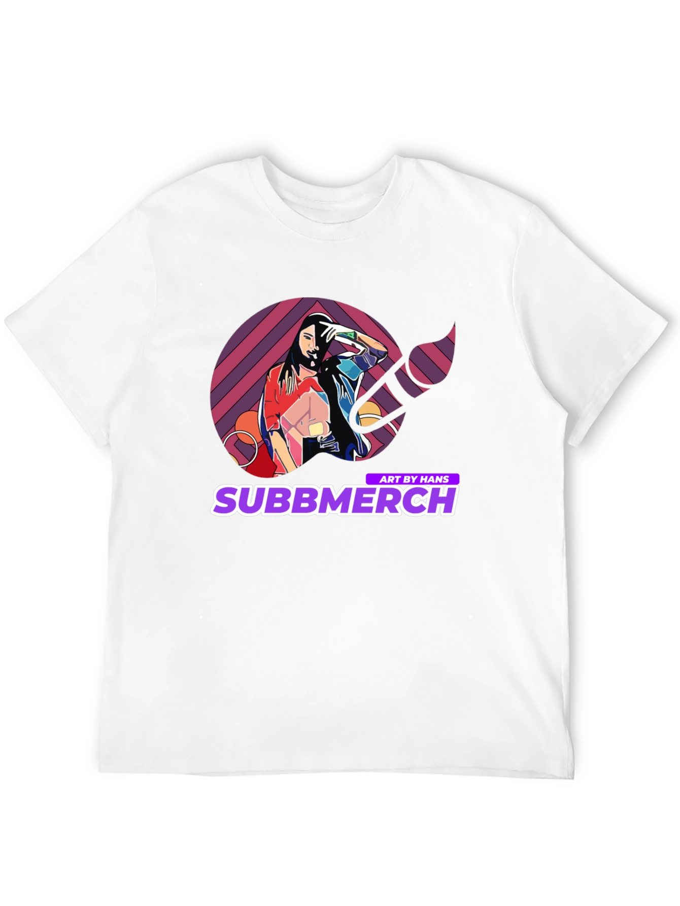 Elevate your casual wardrobe with this striking black t-shirt featuring a unique and vibrant graphic design. The artwork showcases a stylized image of a woman within a colorful geometric pattern, complemented by the 'Subbmerch' logo. Perfect for art enthusiasts and those who appreciate eye-catching apparel, this tee is made from a soft, comfortable fabric, ideal for everyday wear. Make a bold statement with this trendy piece, perfect for concerts, casual outings, or adding a creative touch to your style.