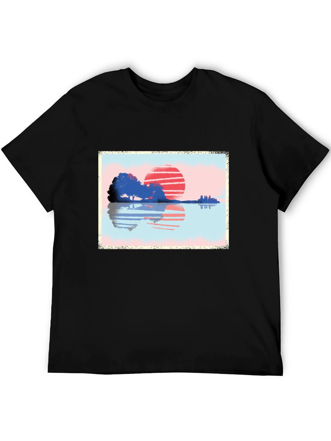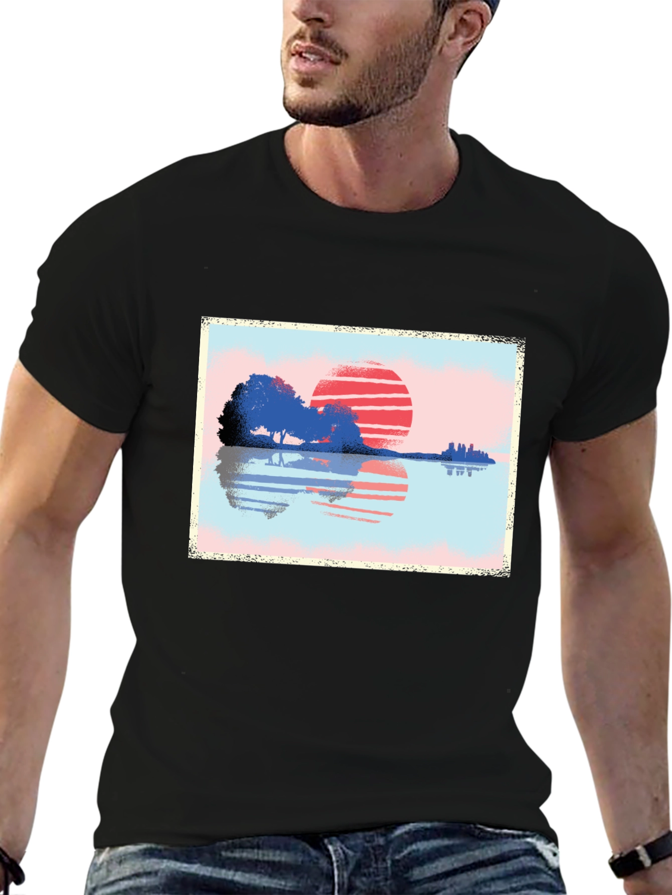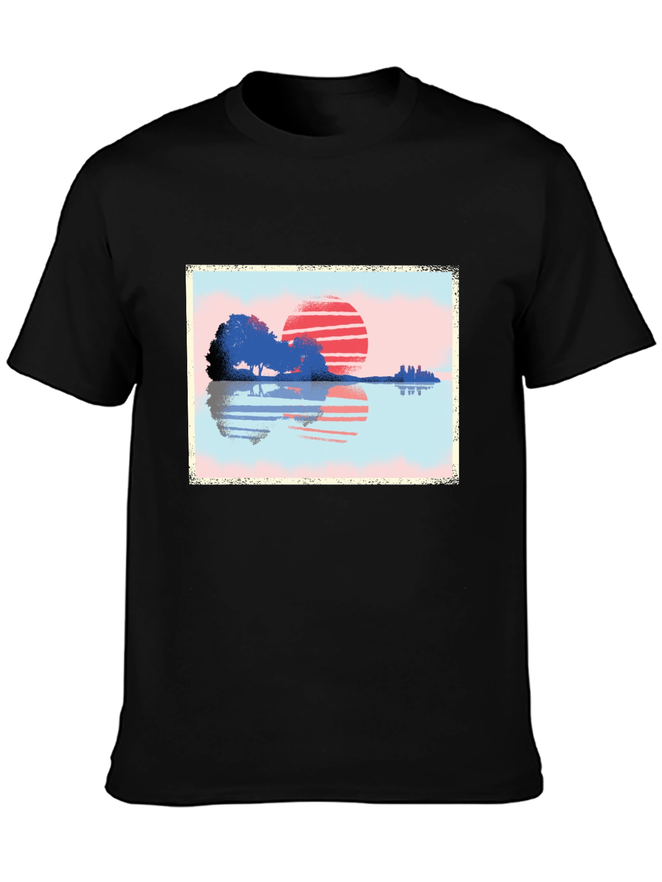 Embrace the beauty of nature with this unique graphic t-shirt. The design showcases a serene sunset reflecting over a tranquil body of water, complete with silhouetted trees and distant shoreline. The artwork is presented within a subtly textured border, adding a touch of vintage charm. Made from a comfortable and breathable fabric, this black t-shirt is perfect for everyday wear. Pair it with your favorite jeans for a casual look, or dress it up with a blazer for a night out. A must-have for nature lovers and art enthusiasts alike!