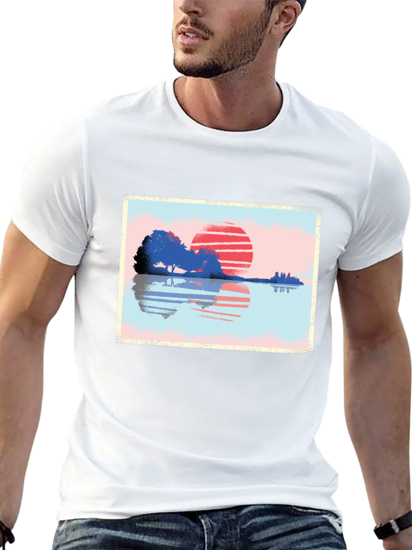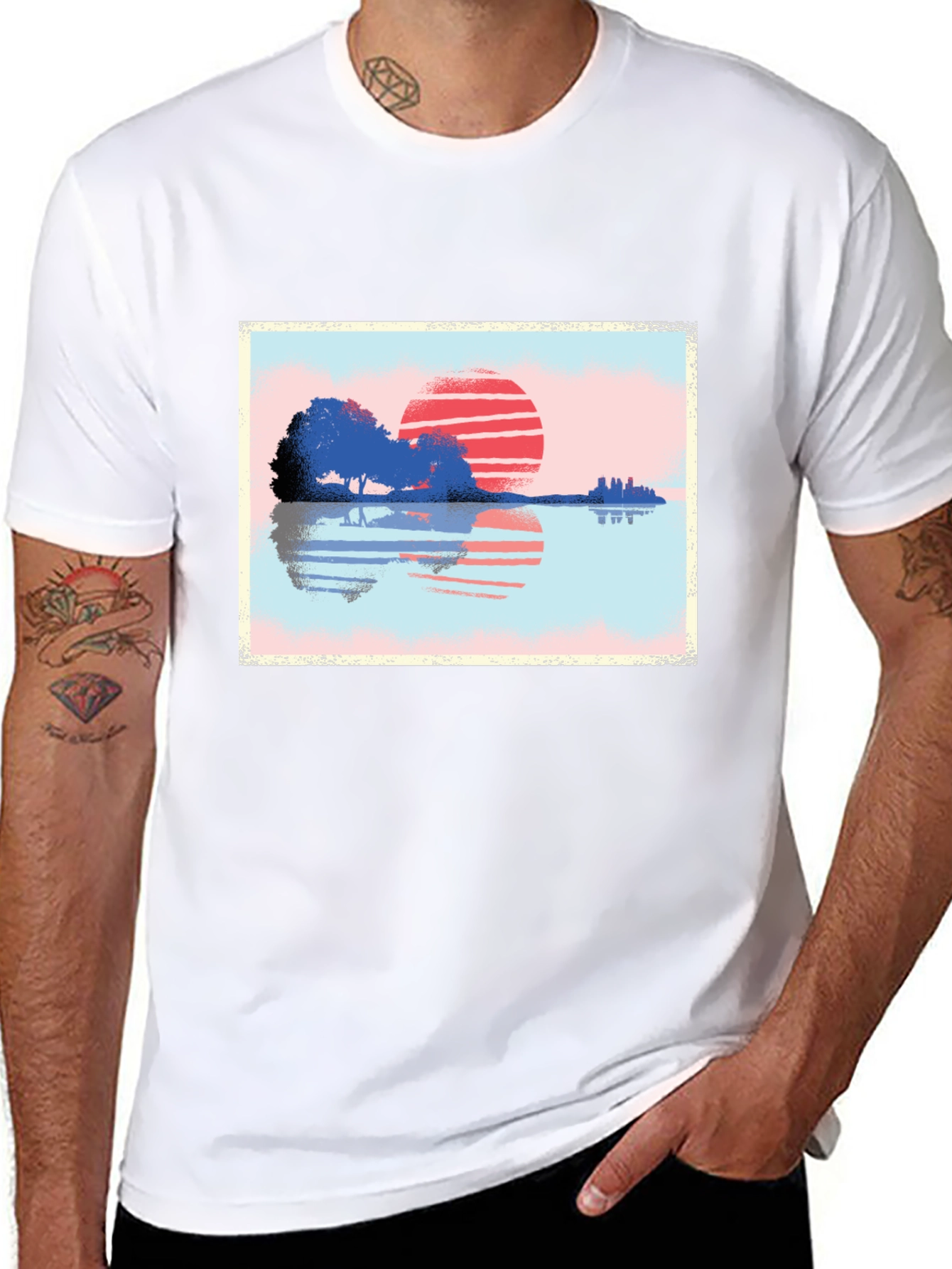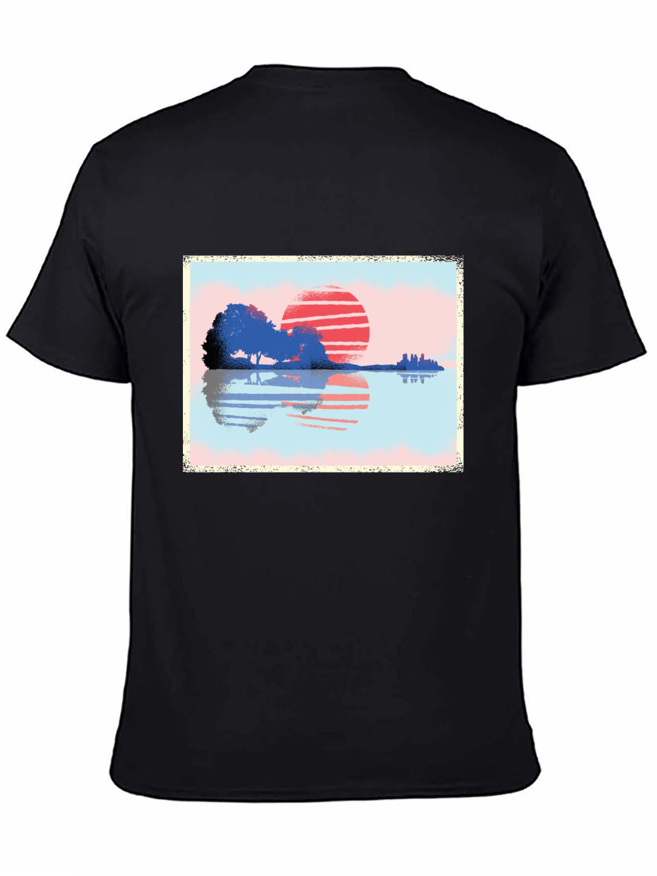 Embrace the beauty of nature with this unique graphic t-shirt. The design showcases a serene sunset reflecting over a tranquil body of water, complete with silhouetted trees and distant shoreline. The artwork is presented within a subtly textured border, adding a touch of vintage charm. Made from a comfortable and breathable fabric, this black t-shirt is perfect for everyday wear. Pair it with your favorite jeans for a casual look, or dress it up with a blazer for a night out. A must-have for nature lovers and art enthusiasts alike!